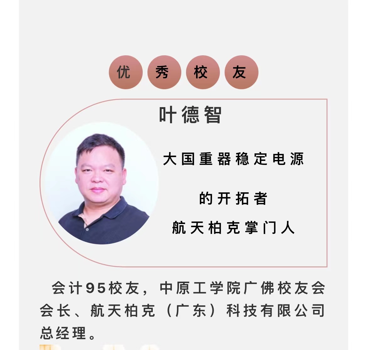 航天柏克总经理叶德智,大国重器稳定电源的开拓者,大力弘扬企业家精神,争当高质量发展领头羊。从一名销售人员转型,带领9名同学和同事创业,到组织团队研发攻克不间断电源,填补国内技术空白;从没有任何基础的小企业起步,到年销售预计达4亿元、被央企收购的细分领域领头羊公司。如今,从我国自主研制的大型客机C919,到破解蜀道千年之难的西城高铁,再到创下多个世界之最的港珠澳大桥……都离不开其带领团队研发的产品,为大国重器筑起坚强的后盾保障。12年时间,他凭着卓越的领导力和超前、独到的眼光,带领企业为市场提供可靠、高效、稳定的电源解决方案。他就是航天柏克(广东)科技有限公司总经理叶德智。