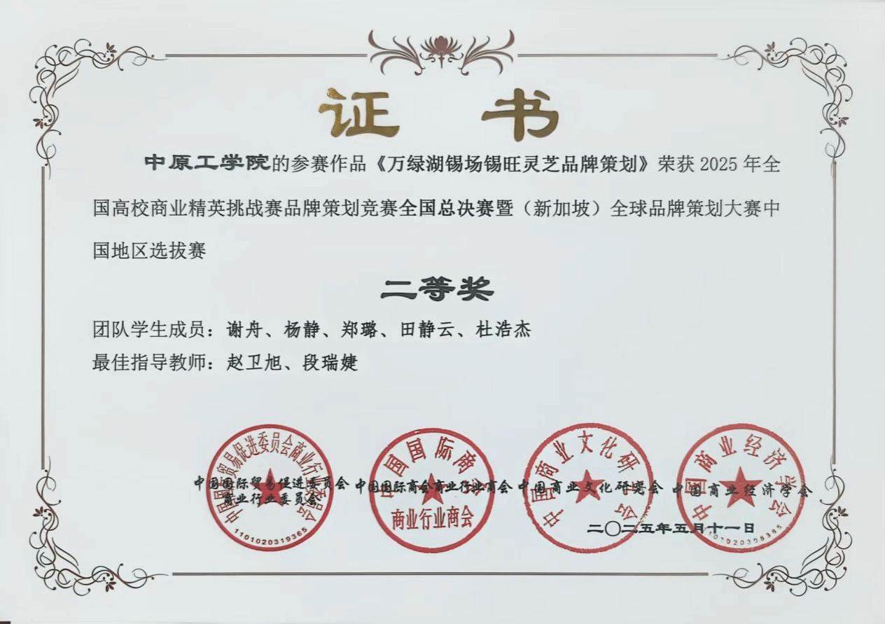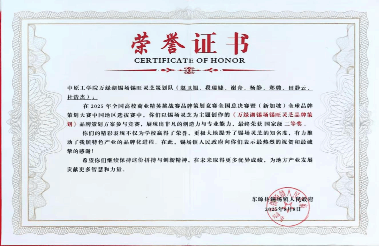 近日,2025年全国高校商业精英挑战赛品牌策划竞赛全国总决赛暨(新加坡)全球品牌策划大赛中国地区选拔赛落幕,我院赵卫旭、段瑞捷两位老师带领学生团队(谢舟、杨静、郑璐、田静云、杜浩杰),为广东省河源市锡场锡旺农业发展有限公司量身打造的《万绿湖锡场锡旺灵芝品牌策划》方案,凭借创新实践价值斩获全国二等奖,东源县锡场镇人民政府同步为团队颁发荣誉证书,表彰该团队对当地灵芝产业品牌化发展的突出贡献。