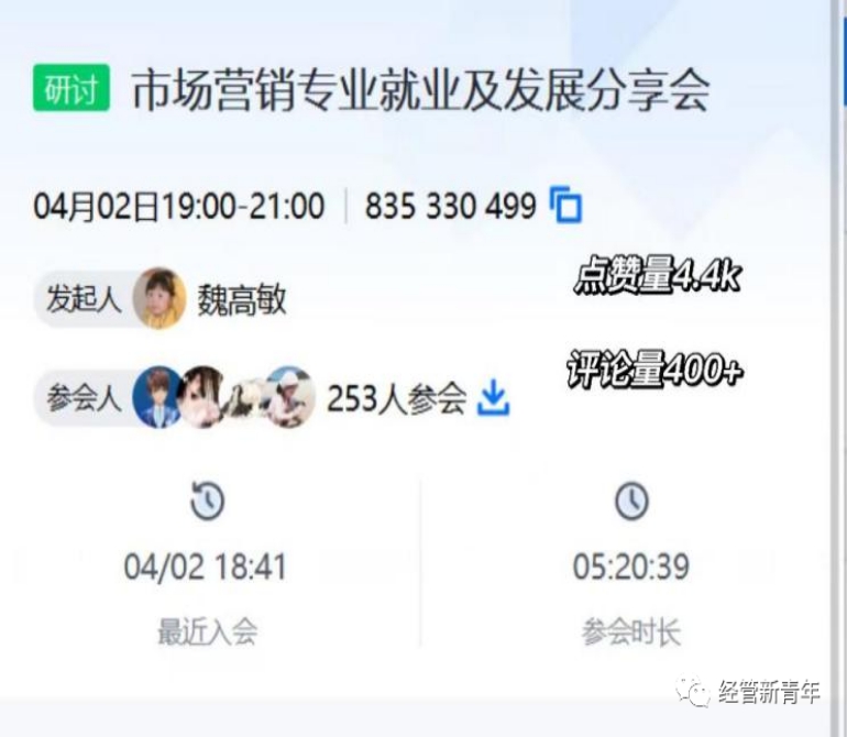 4月2日晚七点,我院市场营销专业13位校友与在校生通过腾讯会议平台进行了线上就业创业经验分享和交流。学院党委副书记王琳、团委书记郭姗、市场营销系主任赵卫红、副主任孙小丽及200余名师生参加了此次会议。