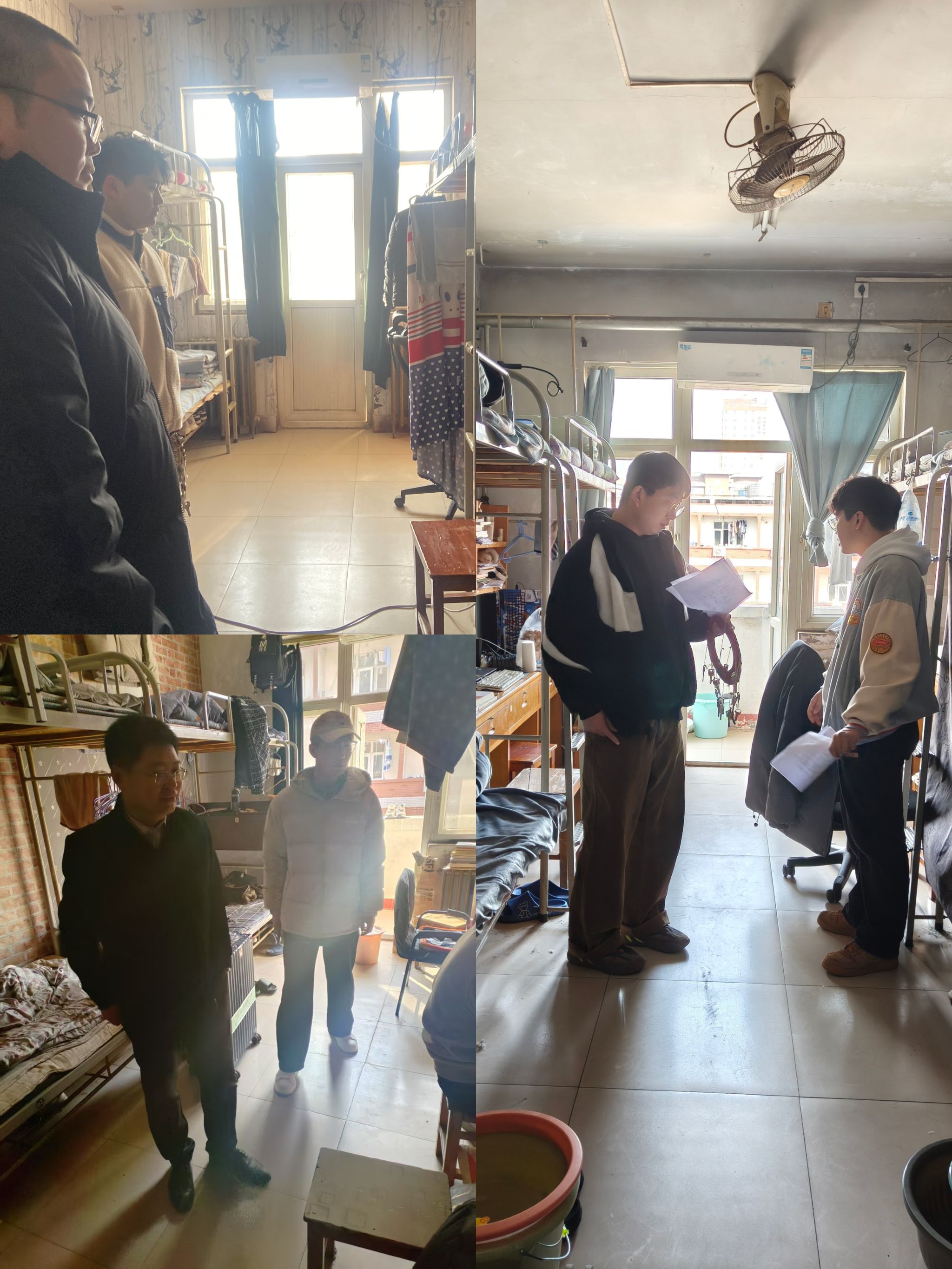 2月24日至2月27日,学院开展了学生宿舍走访活动。走访过程中,学院副书记、辅导员、班主任对宿舍卫生状况、用电安全以及是否存在违规电器等情况进行了全面排查。针对检查中发现的宿舍卫生问题、电源线使用不规范等问题,现场提出整改意见,并逐一核对宿舍成员到校信息,对因特殊情况暂未返校的学生做好记录并跟进联系。期间,学院副书记和辅导员们与同学们亲切交谈,详细询问寒假生活、学习、实践等情况,耐心倾听并对同学们新学期的规划给予指导和鼓励。