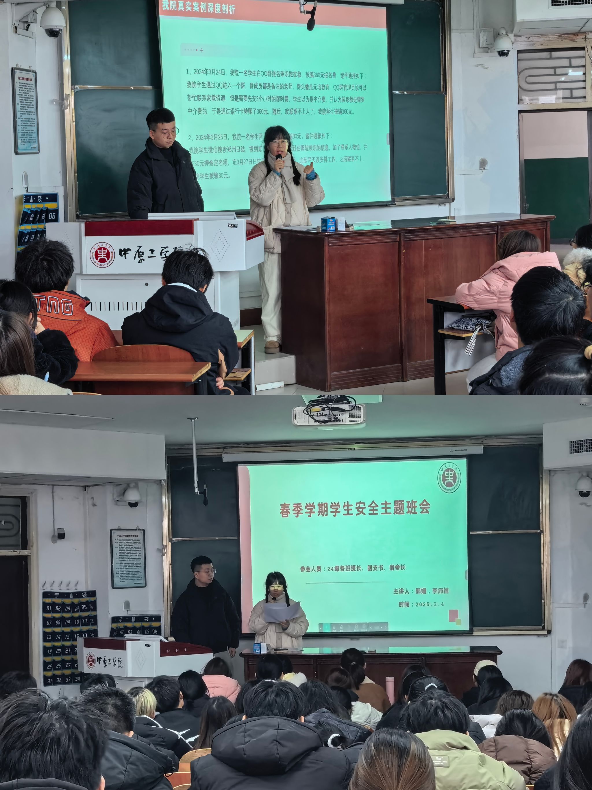 3月6日,在4号教学楼211教室,24级辅导员郭姗与李沛恒,采用“案例剖析+法律解读+互动问答”的创新模式,将电信网络诈骗、财产安全、消防安全等知识点深入浅出地传授给学生,尤其是宿舍长“心理观察员”机制的引入,更是体现了学院对学生心理健康的高度关注与细致关怀。