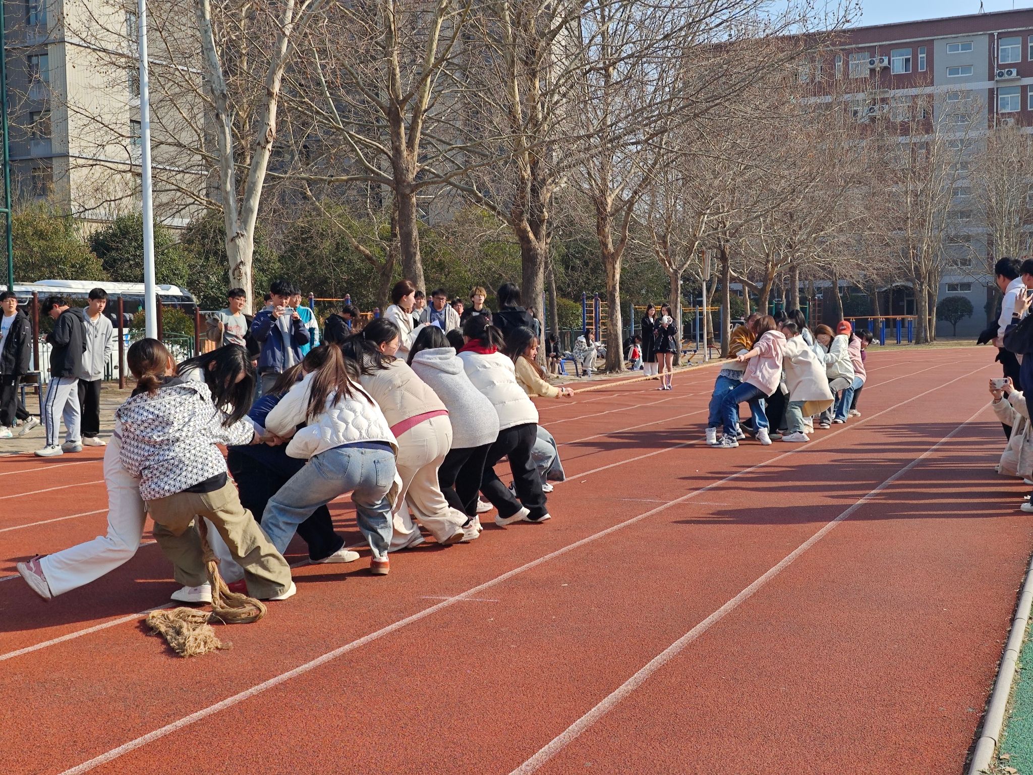 双方参赛队员们精神抖擞,斗志昂扬,把全身的力量凝聚在手上,身体后倾,拉紧绳子,咬紧牙关。麻绳紧绷如弦,逆风翻盘的瞬间,是集体意志同频共振的最佳诠释。