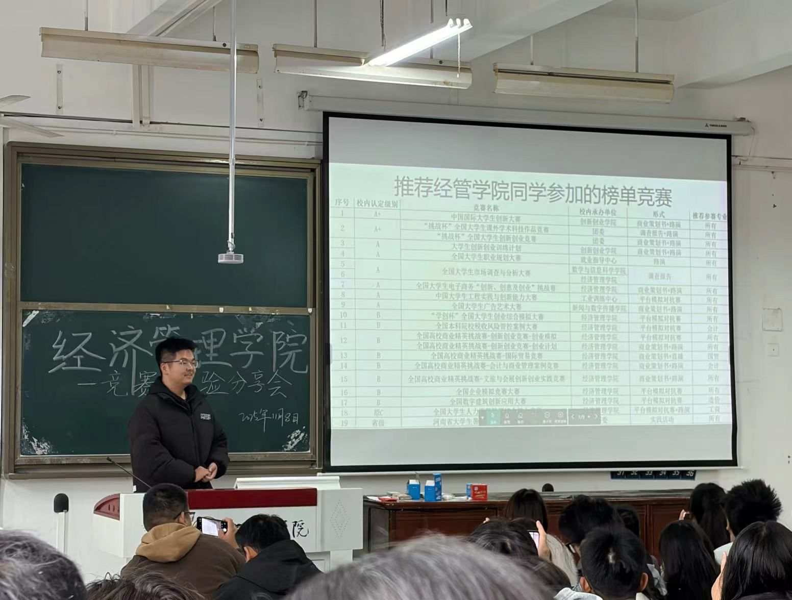 为帮助2025级新生掌握各类竞赛备赛技巧,提升个人竞争力,11月8日上午,我院在3号教学楼102教室举办竞赛经验分享会。会议由工商管理专业2022级杨廷知、工商管理专业2023级王天赐以及国贸专业2022级朱志强担任分享嘉宾,2025级共120余名学生参与。