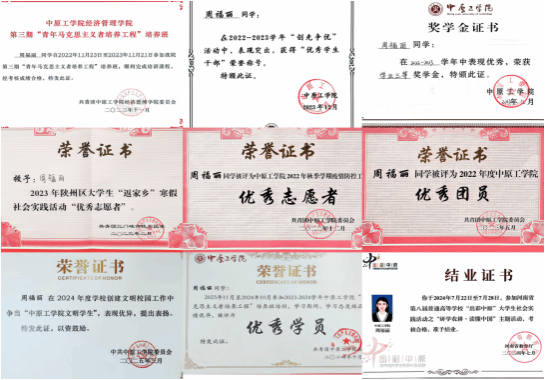 方向指引道路,信仰照亮青春。她时刻以党员标准鞭策自我,积极参与思政教育活动,淬炼政治品格。获评“河南省优秀共青团员”(校团委推荐),并在校第六期“青马班”以优异表现荣膺“优秀学员”。“优秀团员”、“优秀学生干部” 等称号接踵而至,荣誉是认可,更是砥砺前行的号角。