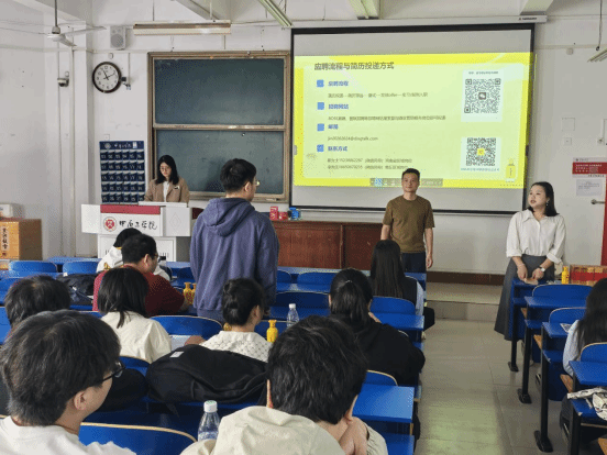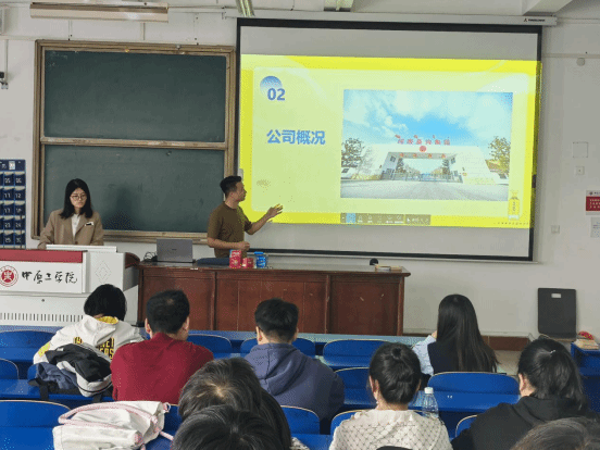 会上,刘涛向同学们详细介绍了企业的行业地位、主营业务、发展现状及未来规划,并介绍了招聘岗位的名称、岗位职责、任职要求、工作地点、薪资待遇等相关内容。参会学生认真聆听,并就面试环节安排、工作具体内容、发展空间等问题与企业进行了互动交流。